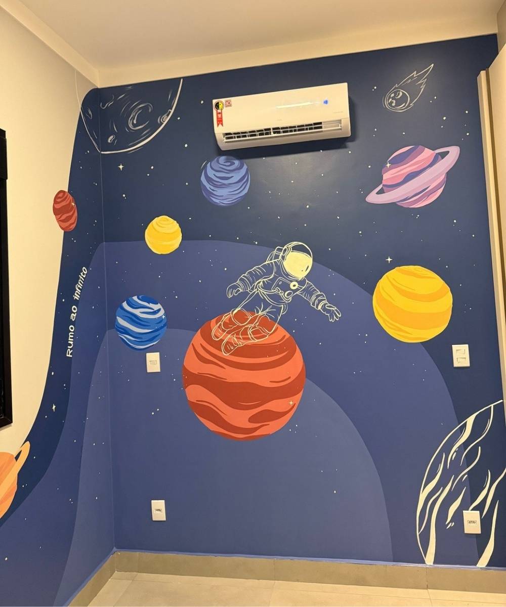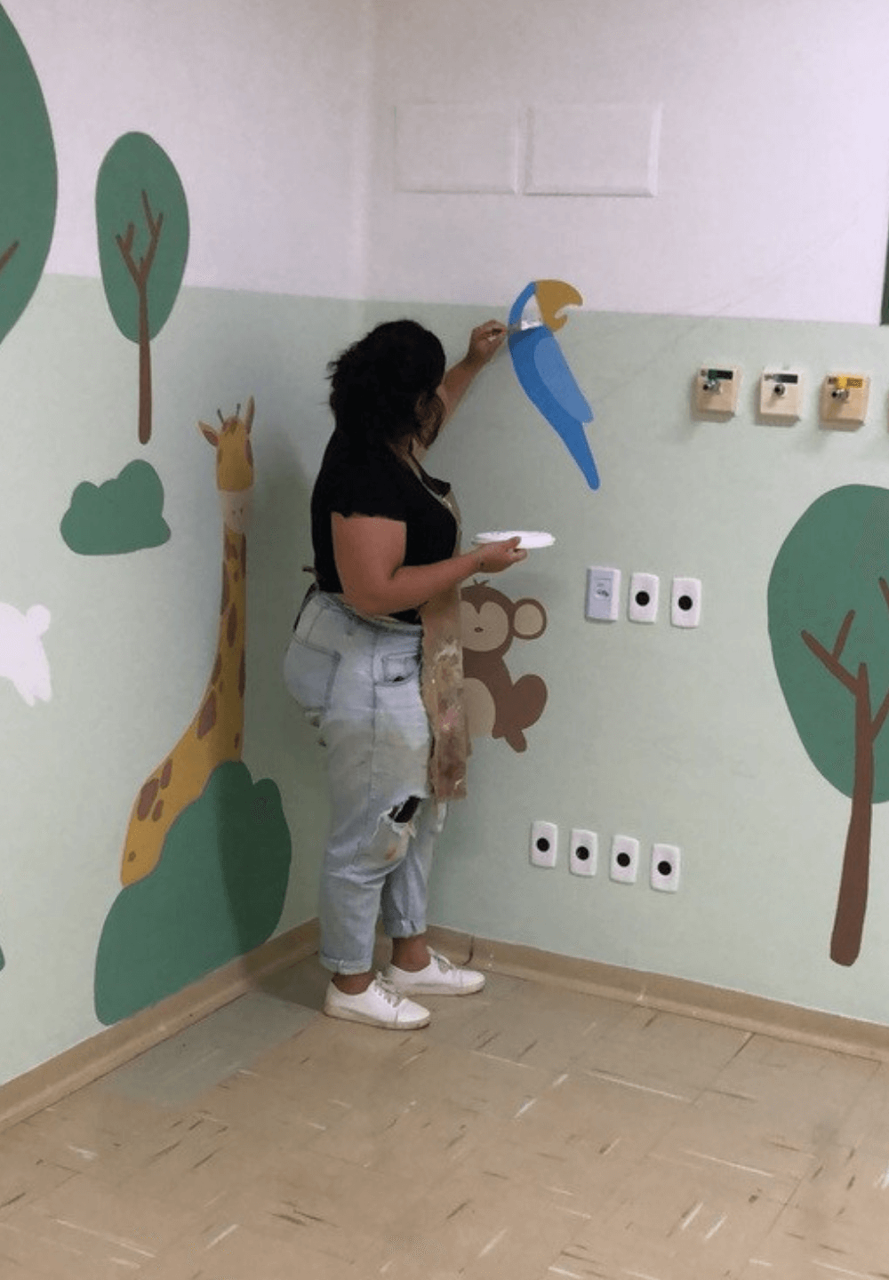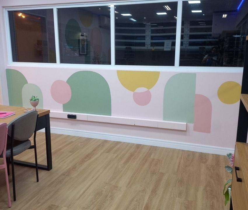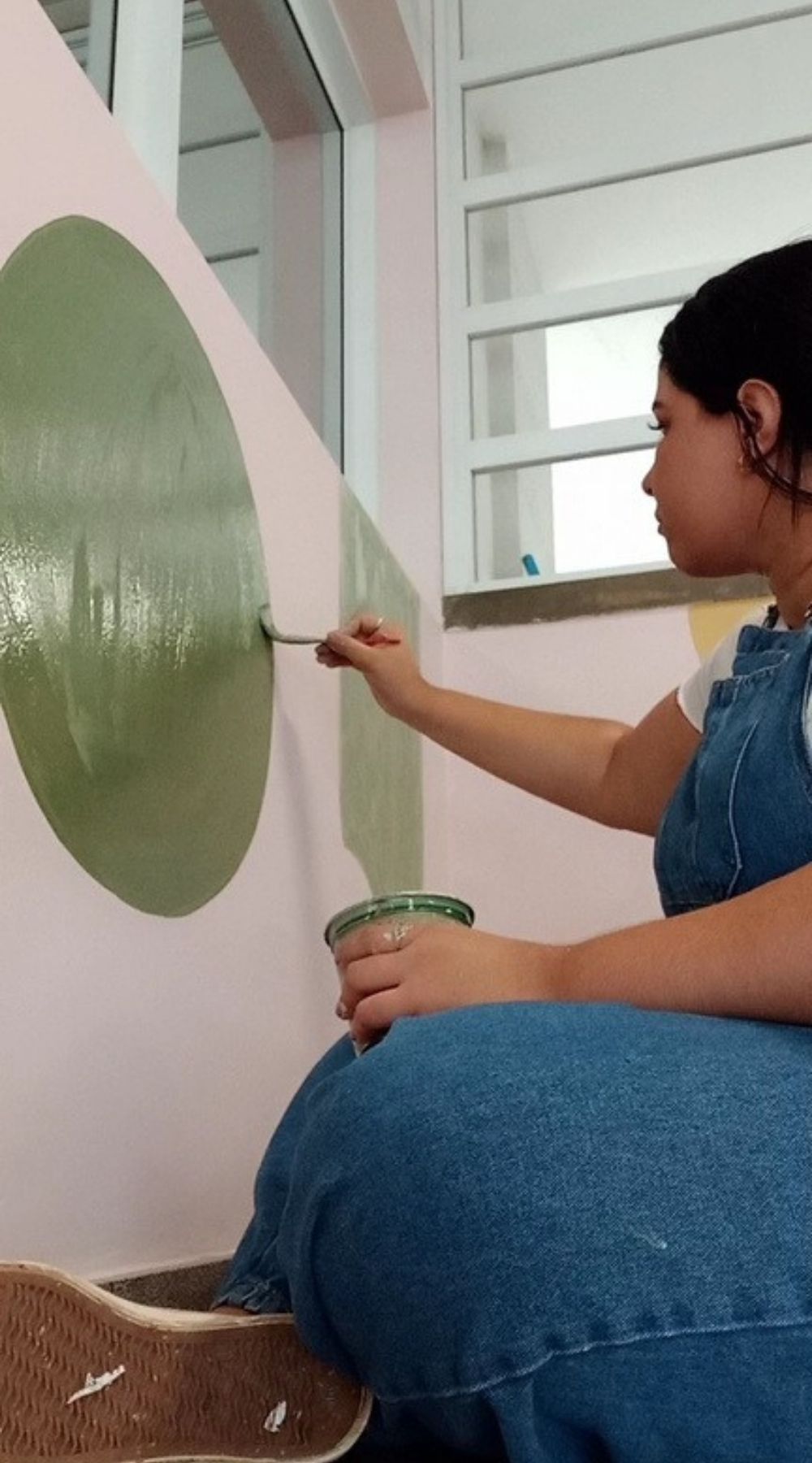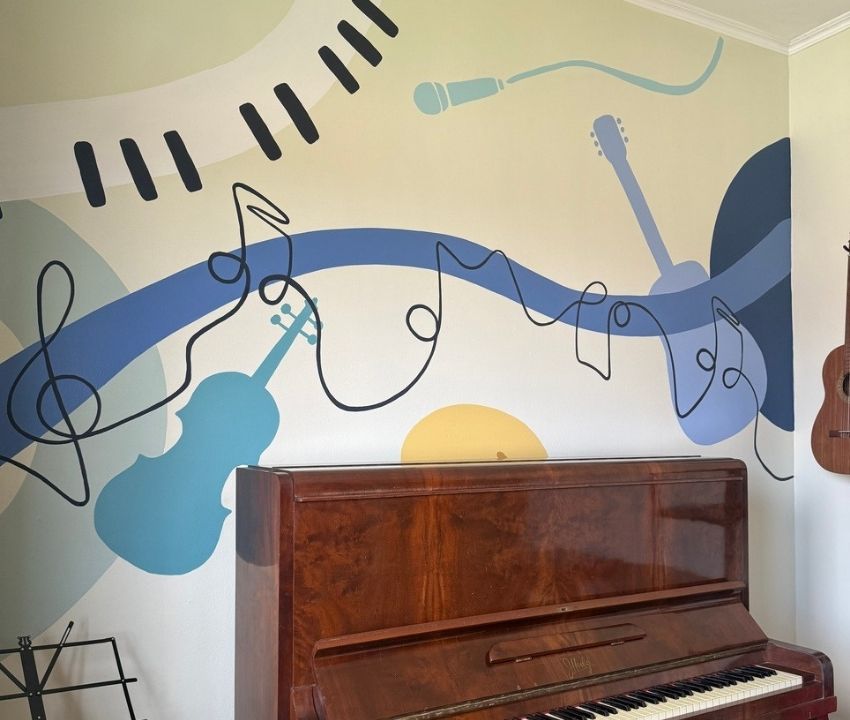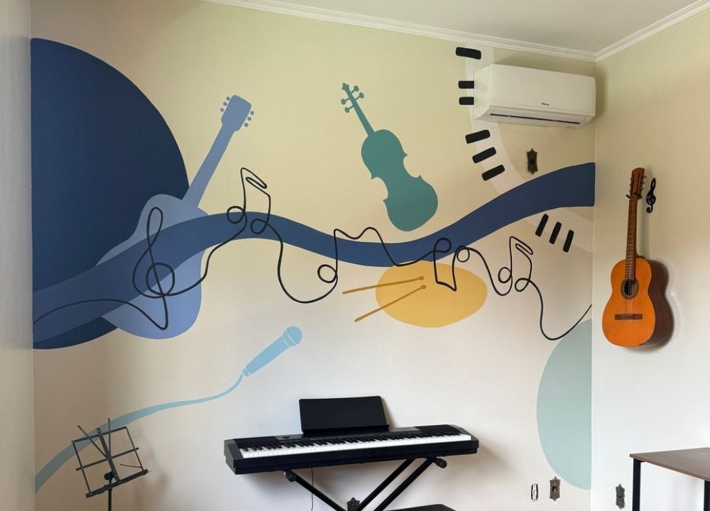 Pintura artística na Casa da Música, planejada para integrar identidade visual, fluxo do espaço e temática musical, contribuindo para um ambiente mais coerente com a proposta pedagógica da escola.